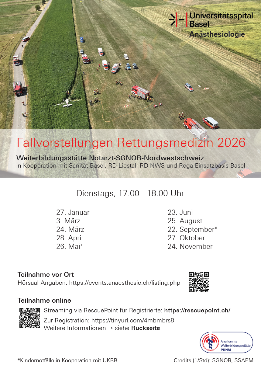 Die Fallvorstellungen Rettungsmedizin finden in der Regel am letzten Dienstag im Monat von 17:00 bis 18:00 im Hörsaal 5 des Universitätsspitals Basel statt. Die online-Teilnahme von extern ist via RescuePoint möglich. Sie müssen registriert sein und sich via Login authentifizieren.